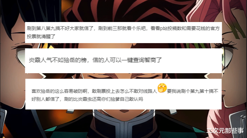 也因为这样的结果,不少人就质疑这个投票有人刷票,特别是反派角色的粉丝,不然就说是野榜。但也有一些人反驳说这个网站并不是野榜,而且就算能刷票那也是大家都能刷,甚至还有人特意晒出了近期《鬼灭之刃》的周边销售数据,以此证明这些反派角色的人气本来就不低,排名靠前也在情理之中。