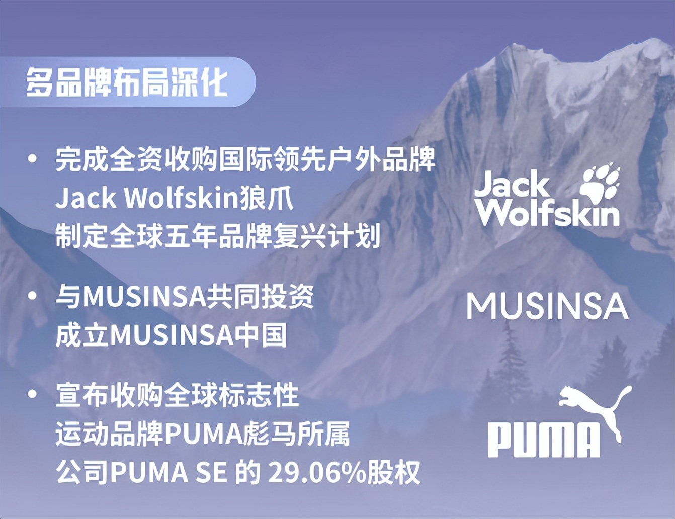 安踏则走“多品牌”扩张之路,通过收购和自主孵化构建起覆盖大众运动、高端时尚、专业户外等多元赛道的品牌矩阵。从FILA到迪桑特、可隆,再到狼爪、PUMA,安踏的“运动宇宙”边界不断延伸。多品牌策略的优势在于能够捕捉不同细分市场的增长红利,但同时也考验集团的品牌运营和资源整合能力。