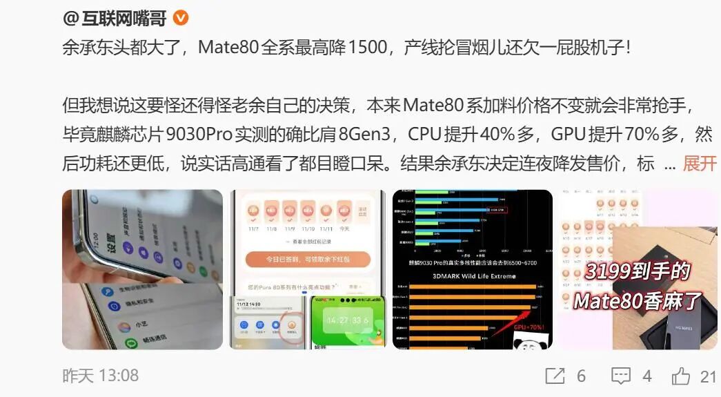 不过有个小遗憾,Mate 80 Pro、Pro Max 和 RS 非凡大师这三款机型现在还是缺货,主要是麒麟 9030 芯片产能跟不上,有消息说要等到 12 月底才能全面供货。这里必须提醒大家,千万别加价买!过去两年 Mate 系列新机刚发布也缺货,很多花粉加价入手后没多久就后悔了,毕竟这又不是刚需,早买早享受但没必要多花冤枉钱。