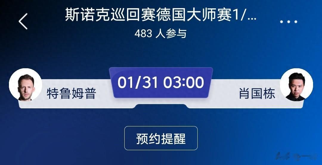 2026年1月31日凌晨03:00,斯诺克巡回赛德国大师赛1/4决赛,肖国栋对阵特鲁姆普。