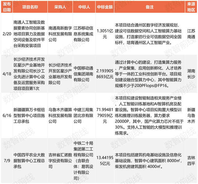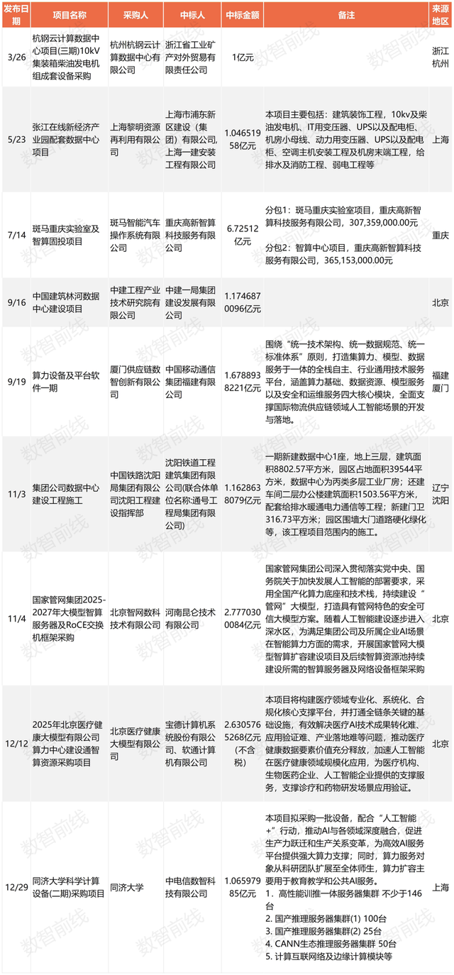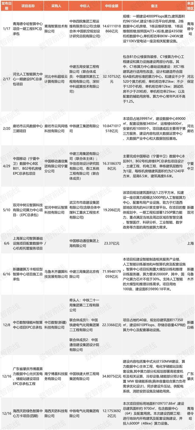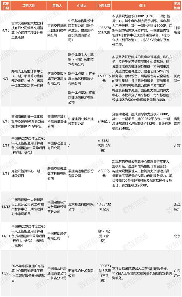 最近,数智前线通过中国政府采购网、中国招投标公共服务平台、天眼查、企查查、寻标宝等渠道梳理发现,2025年的公开招投标市场上,围绕土建基础设施、IT基础架构、服务器采购等方方面面的建设内容,国内单个中标金额亿元以上的智算中心、数据中心相关项目在222个以上。在这些项目中,我们看到了一些值得关注的趋势和特征: