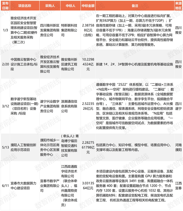 具体来看,政府主导建设或政企合作型的项目,依然不少。如雅安经济技术开发区园区安全智慧管理系统建设项目(智算中心二期)软硬件及相关服务采购(2.39亿元),数字遂宁新型基础设施建设项目(一期)设备采购(2.52亿元)等。