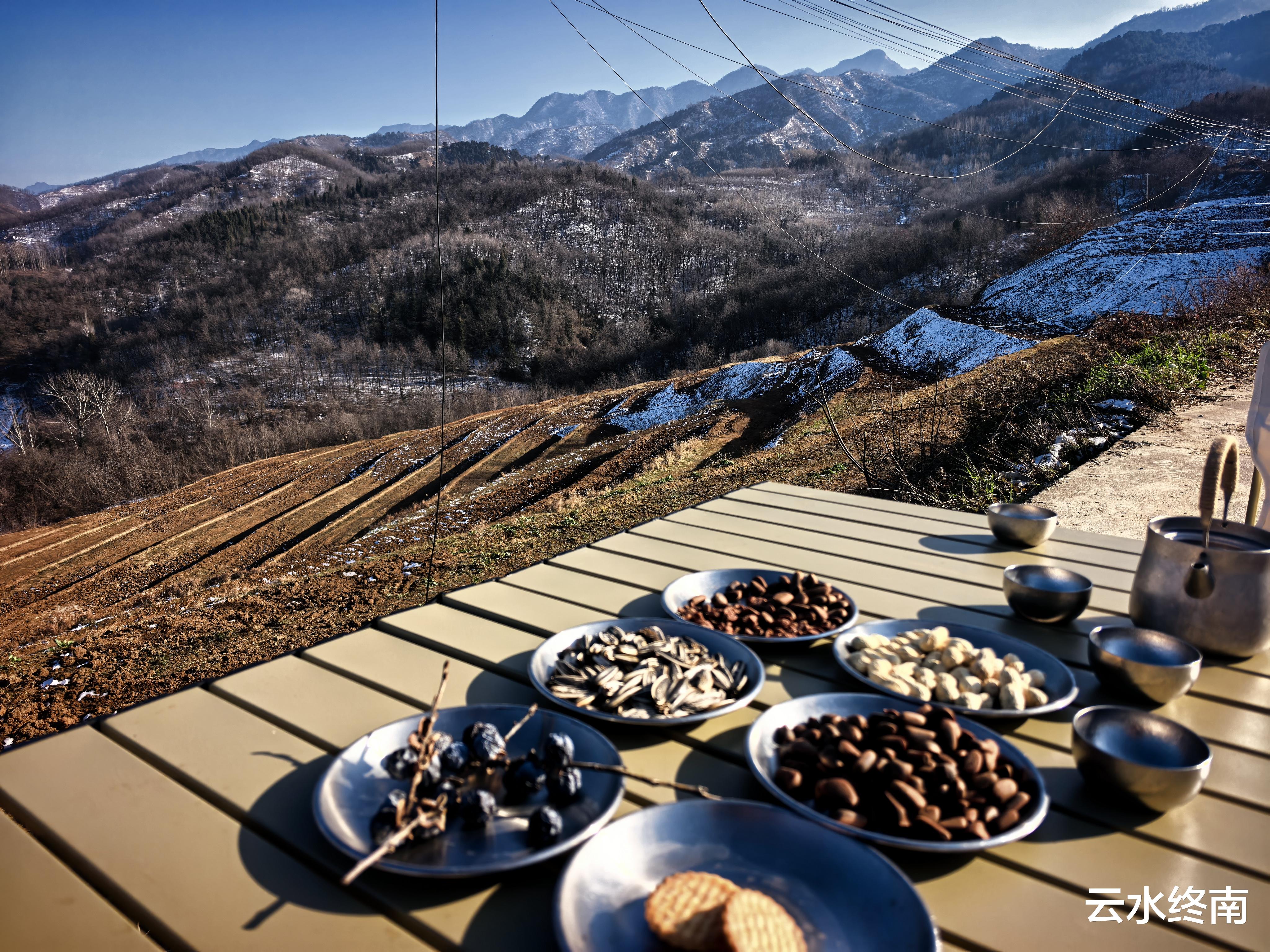 体验了今年的首次雪上行走后,我们还是返回的阳光灿烂的山梁上,在这里喝茶晒暖暖。