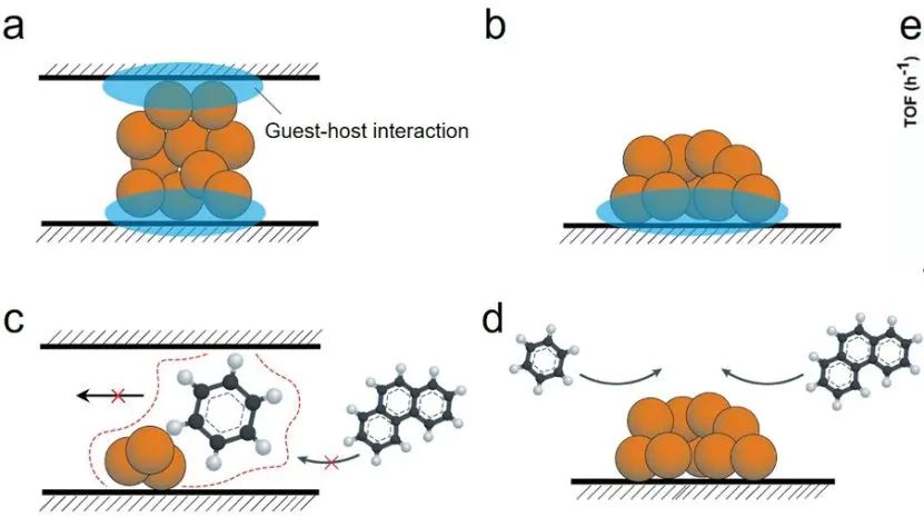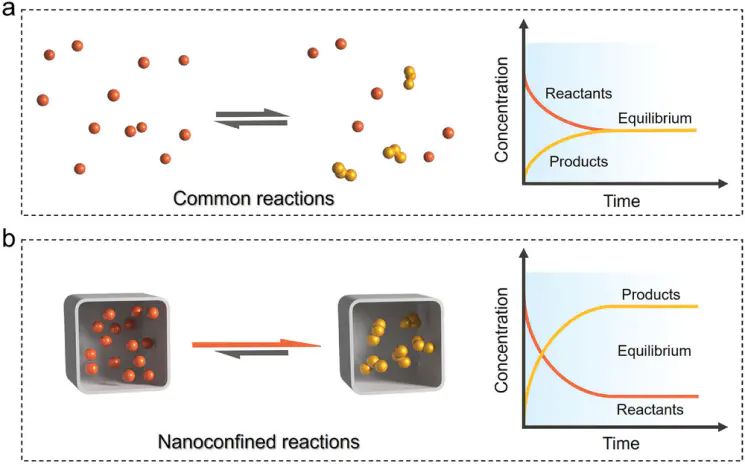 在体相反应中,反应物浓度低、中间体易分解,导致反应平衡偏向反应物。纳米限域空间可通过富集效应提升局部反应物浓度。