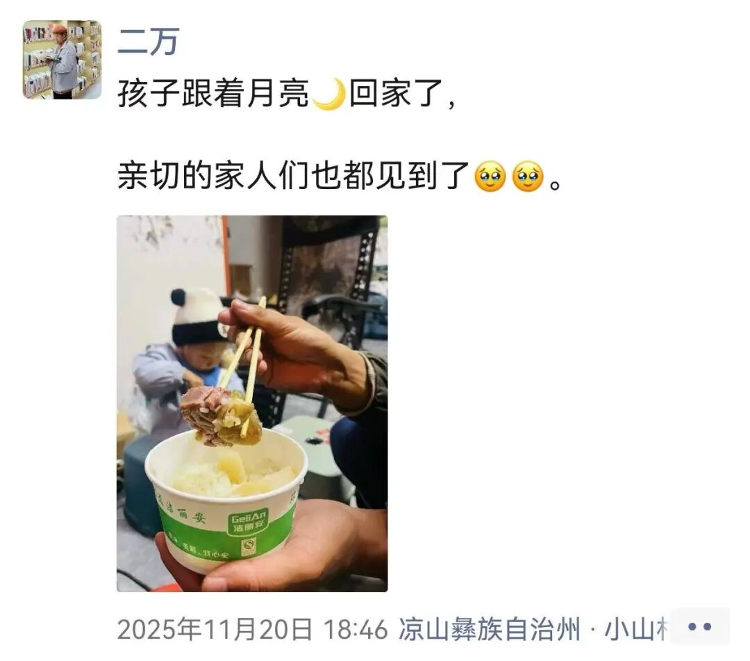 对于在成都挤地铁、做自媒体的彝族青年二万来说,过年的序幕是从跨进凉山家门那一刻开启的。他给我发来一条信息:“孩子跟着月亮回家了。” 随之传来的照片,是火塘边热气腾腾的“坨坨肉”。