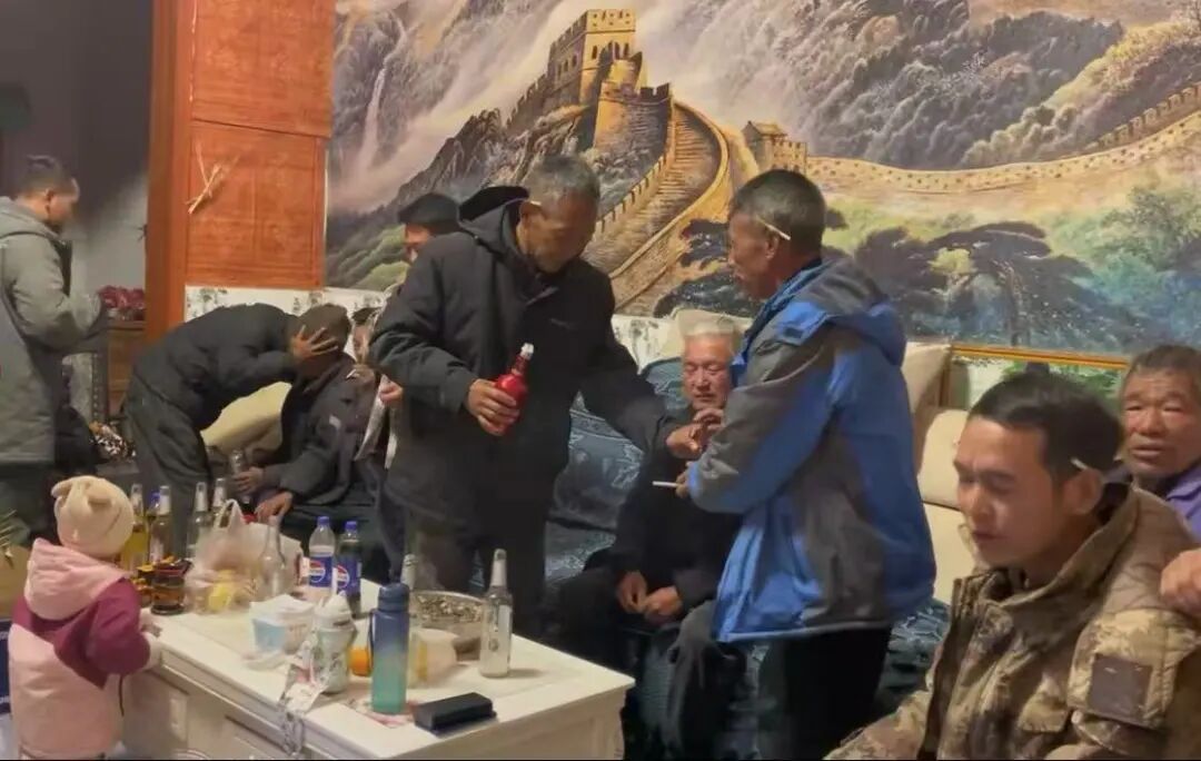 「邻里喝酒拜年,拿酒瓶的为阿达」