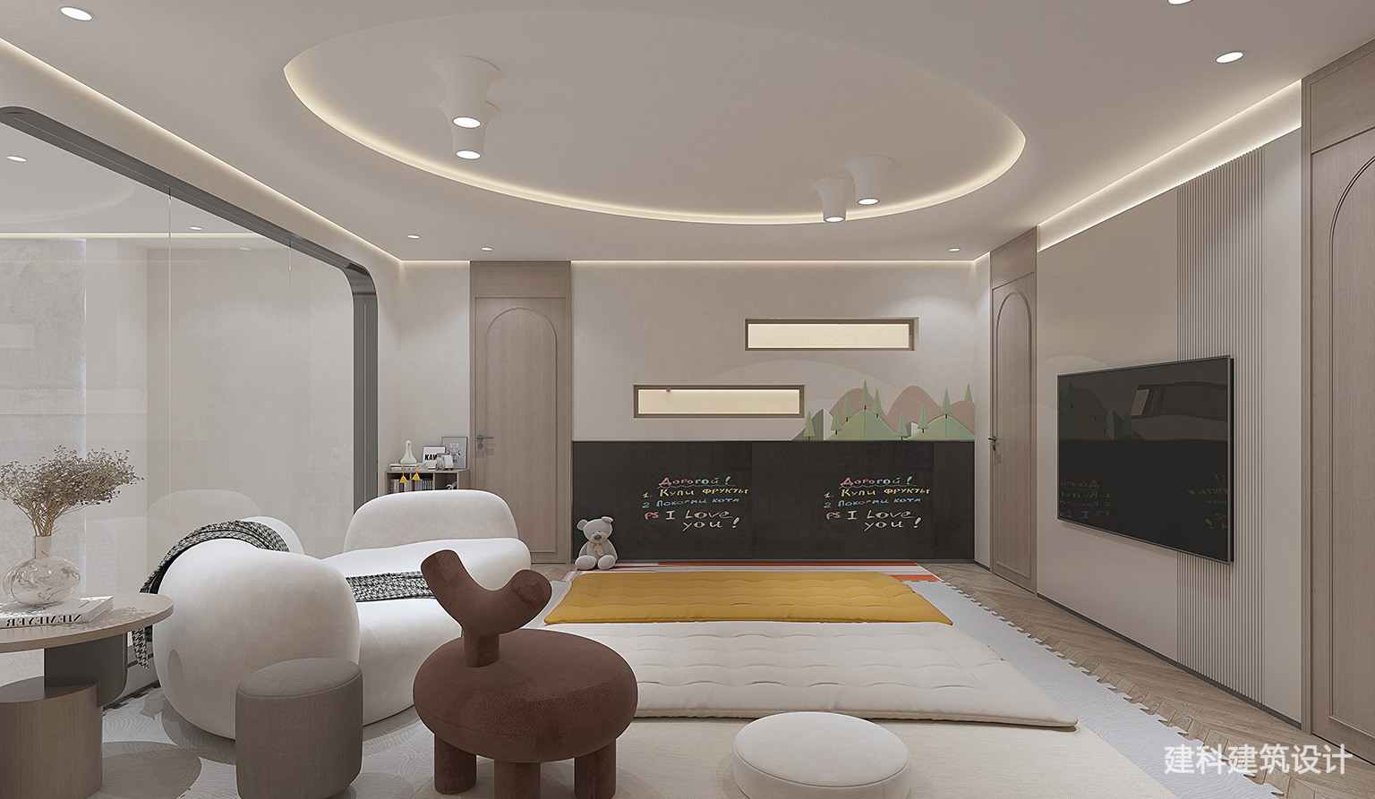 别墅二楼的公共区域,圆弧吊顶+无主灯环绕光,柔化棱角的同时,让整个区域浸在暖调光晕里;通透玻璃隔断+浅木色软装,既拉宽视觉尺度,又守住空间的呼吸感;黑板墙+软包地台的组合,既是亲子互动的小天地,也是日常放空的松弛角落。