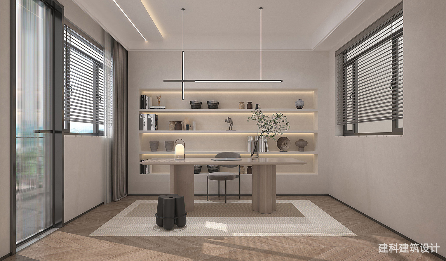 浅调基底揉入柔和木色,嵌入式灯槽书架承托陶艺与书香,线性吊灯牵引光影层次。百叶滤进的柔光裹着松弛,在这里,思绪与空间同频呼吸。