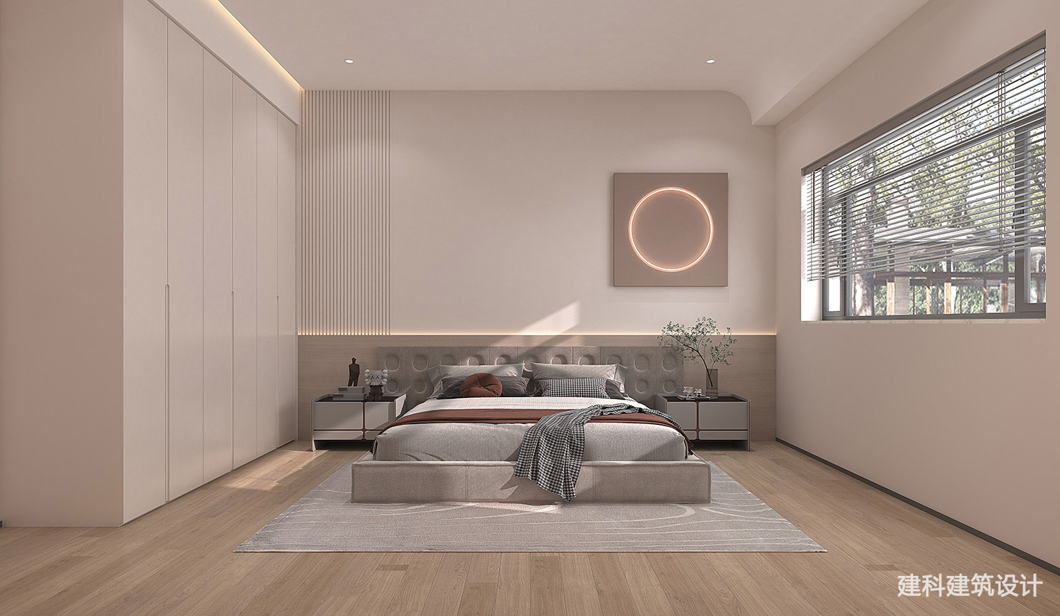 卧室以暖调浅灰为基底,揉入现代极简与轻奢质感,让空间自带呼吸感。左侧通顶定制柜以无把手设计隐去繁复,最大化储物的同时,保持视觉整洁;竖向肌理墙板与弧形吊顶柔化空间棱角,弱化硬朗感。床头肌理背板搭配嵌入式氛围灯,与墙面环形发光装饰画呼应,无主灯+线性光的组合,让光影随情绪柔化。浅木色地板承托柔软床品,窗边百叶滤进细碎光影,将室外绿意揉进室内。每一处材质肌理的层次、每一缕灯光的分寸,都让卧室成为卸下疲惫的治愈场域。