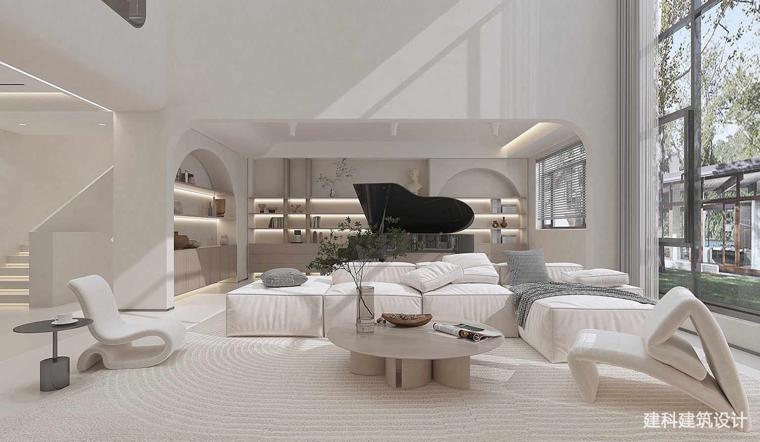 无主灯揉进自然光,大窗衔着庭院绿意,钢琴落进书架的弧里,软榻裹着松弛感。
