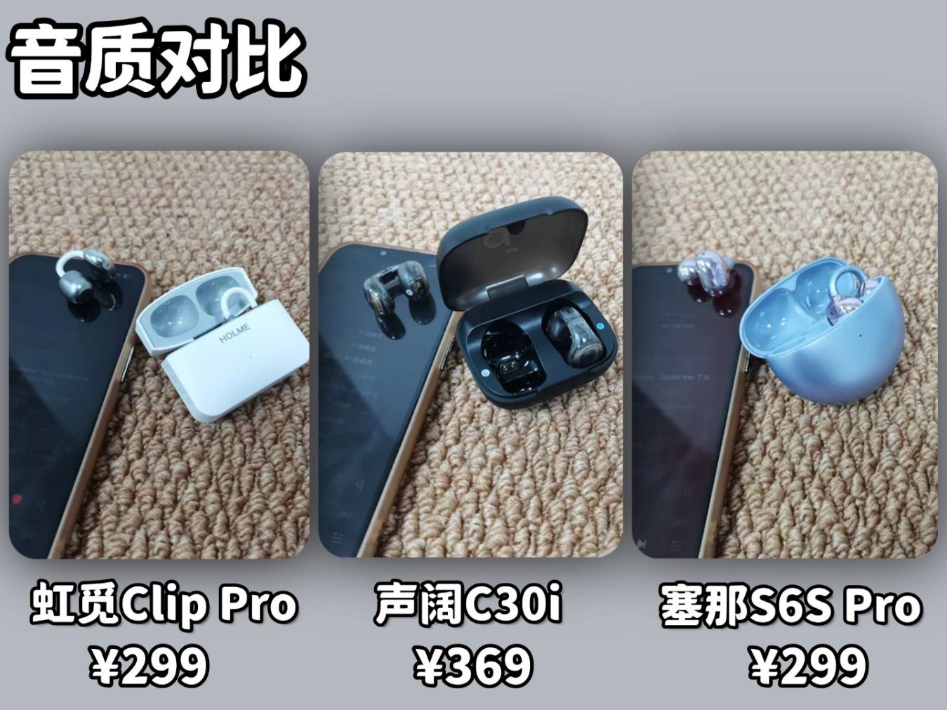 这次专门从近期销量不错、价格也比较亲民的款式里,挑了三款做对比,分别是 299 的虹觅 Clip Pro、299 元的塞那 S6S Pro,还有 369 元的声阔 C30i。接下来就从大家平时最关心的音质、佩戴这些点,跟大家好好聊聊这三款耳机的实际表现,看看哪款更值得入手。相信看完这份对比,你选耳机时能少些纠结。