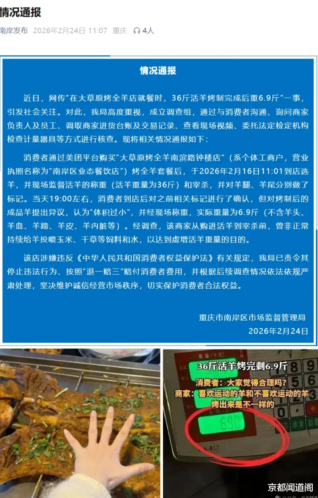 除夕夜的团圆宴,本应暖意融融,重庆王女士一家却遭遇窝心事:花1188元点的烤全羊套餐,现场监督称重的36斤活羊,烤完后竟只剩6.9斤,薄得几乎无肉可食。面对质疑,商家的辩解层层推诿,从“烤完剩四成”到“羊有个体差异”,再到“烤得太干失重多”——每一句说辞都暴露着唯利是图的贪婪与毫无底线的欺诈。