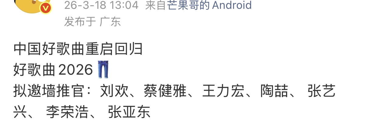 本季节目拟邀墙推官阵容堪称华语乐坛神仙开会,七位大咖分别是:刘欢、蔡健雅、王力宏、陶喆、张艺兴、李荣浩、张亚东,横跨乐坛老中青三代,覆盖原创制作、流行唱作、R&B先锋等全领域,既有殿堂级前辈把关,又有新生代实力干将加盟,专业度与话题度双在线,光看名单就让人迫不及待。