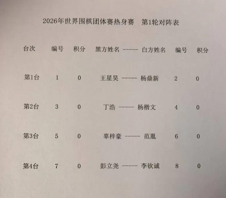 中国国家围棋队的热身赛共进行三轮,据谢锐介绍有奖金还有对局费,也就是1月29日、30日、31日三天各进行一轮,今天的对阵是:王星昊VS杨鼎新、丁浩VS杨楷文、辜梓豪VS范胤、彭立尧VS李钦诚。网友点评,这阵容是聂道队加上陪练杨鼎新、李钦诚。