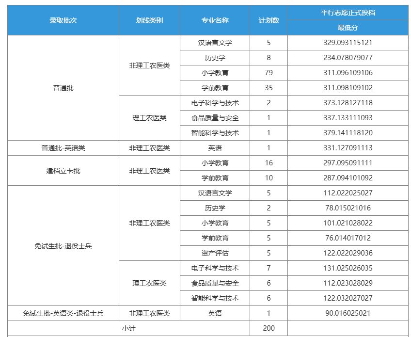 对于建档立卡批,学前教育最低分数线287分,小学教育最低分数线297分。对于退役士兵考生,汉语言文学专业最低分数线112分,历史性最低分数线78分,学前教育最低分数线76分。