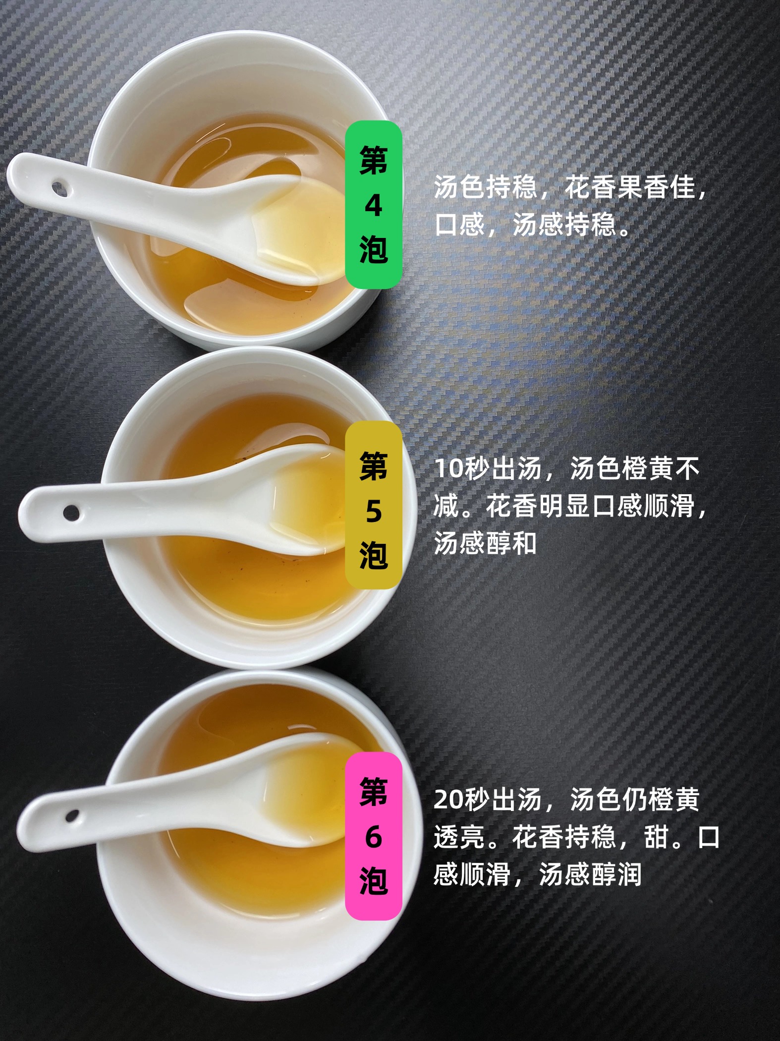 第四泡,汤色持稳,花香果香佳,口感,汤感持稳。