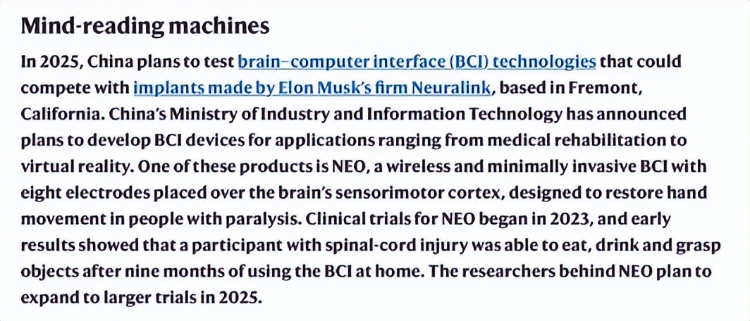 我国自主研发的NEO微创脑机接口系统更是入选《Nature》2025年值得关注的科学事件,作为中国“脑机接口”领域的代表被特别报道。