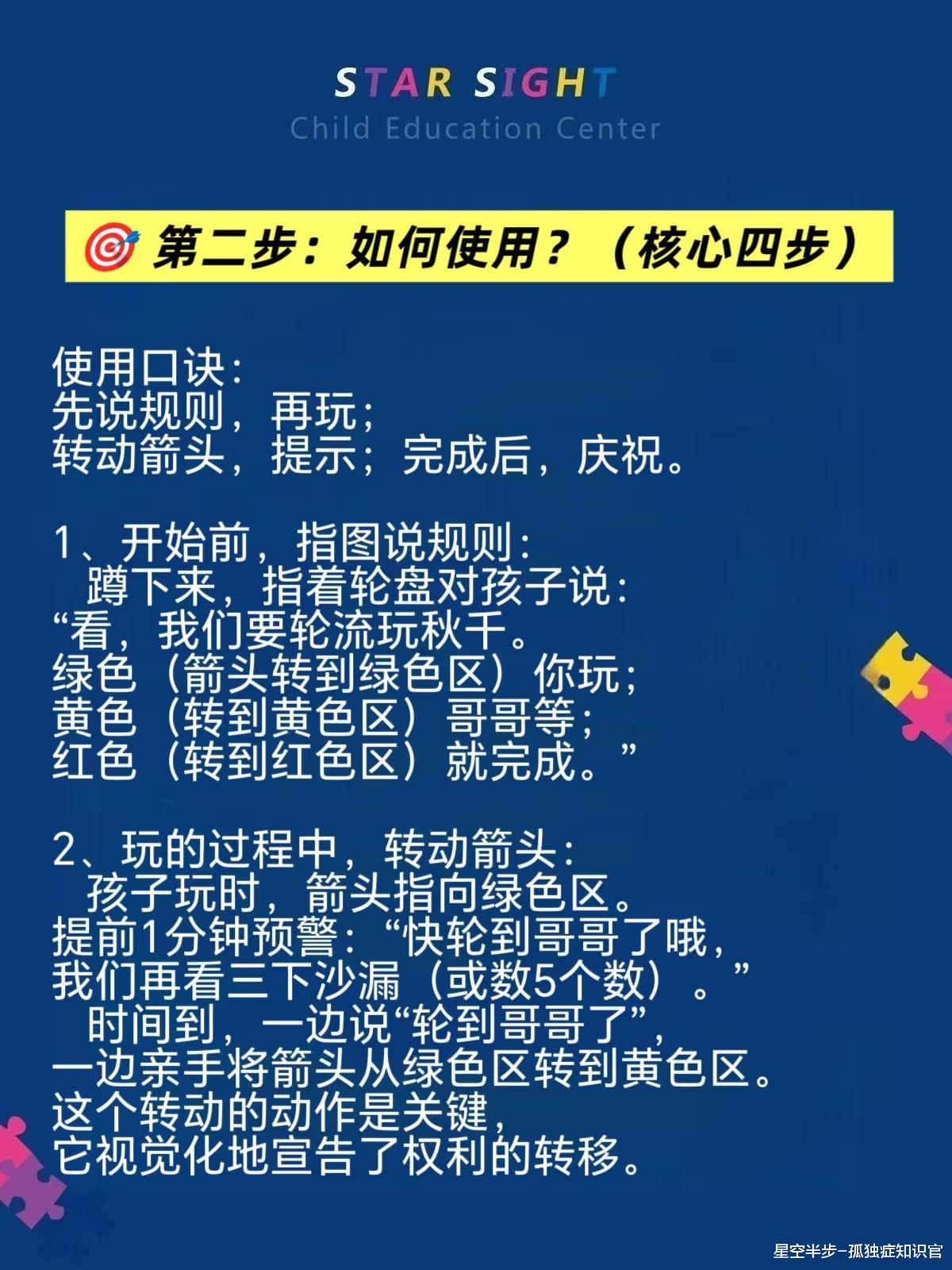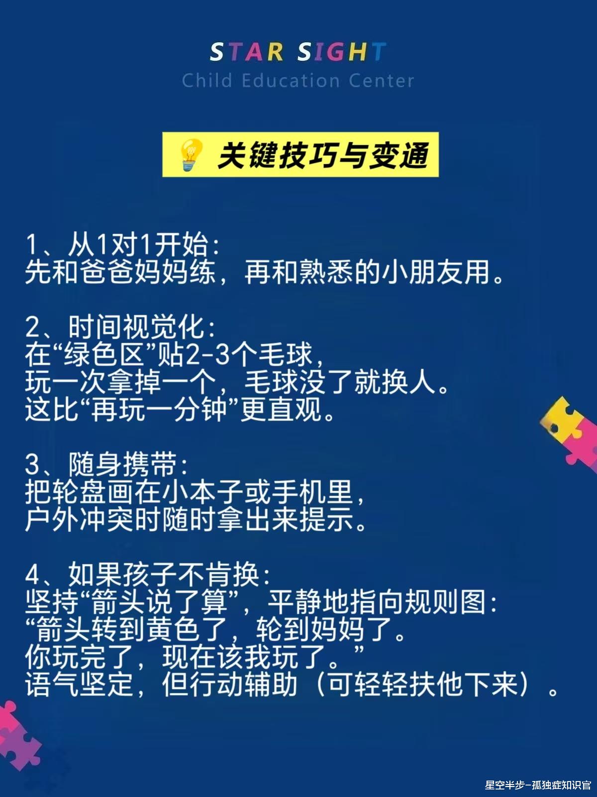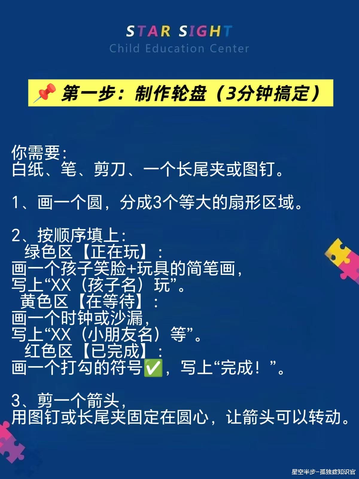 自闭症孩子在游乐场抢玩具、不肯排队,不是“自私”,而是他们真的无法理解“轮流”这个抽象的时间概念。看不到开始,猜不到结束,等待就像一片空白,只会引发焦虑。今天分享一个超简单的 “视觉轮盘” ,把“轮流”变清晰,让孩子用眼睛“看见”社交规则。