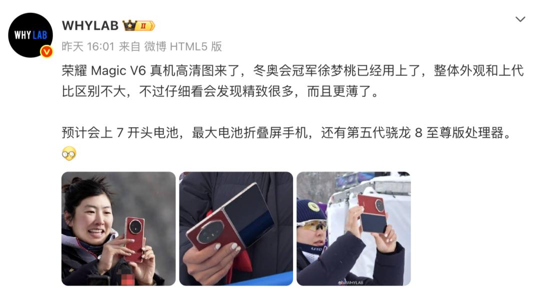 与此同时,博主@WHYLAB 发文表示“荣耀 Magic V6 真机高清图来了,冬奥会冠军徐梦桃已经用上了,整体外观和上代比区别不大,不过仔细看会发现精致很多,而且更薄了。预计会上 7 开头电池,最大电池折叠屏手机,还有第五代骁龙 8 至尊版处理器。”