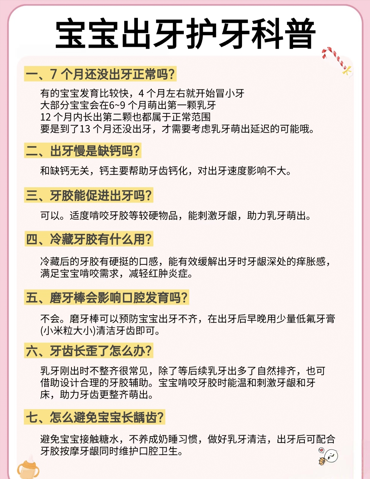宝宝出牙期爱吃手、爱咬东西,口腔细菌容易滋生。我们要用干净的纱布或指套牙刷,蘸温水帮宝宝清洁牙龈和口腔,减少细菌繁殖,预防“萌出性龈炎”。