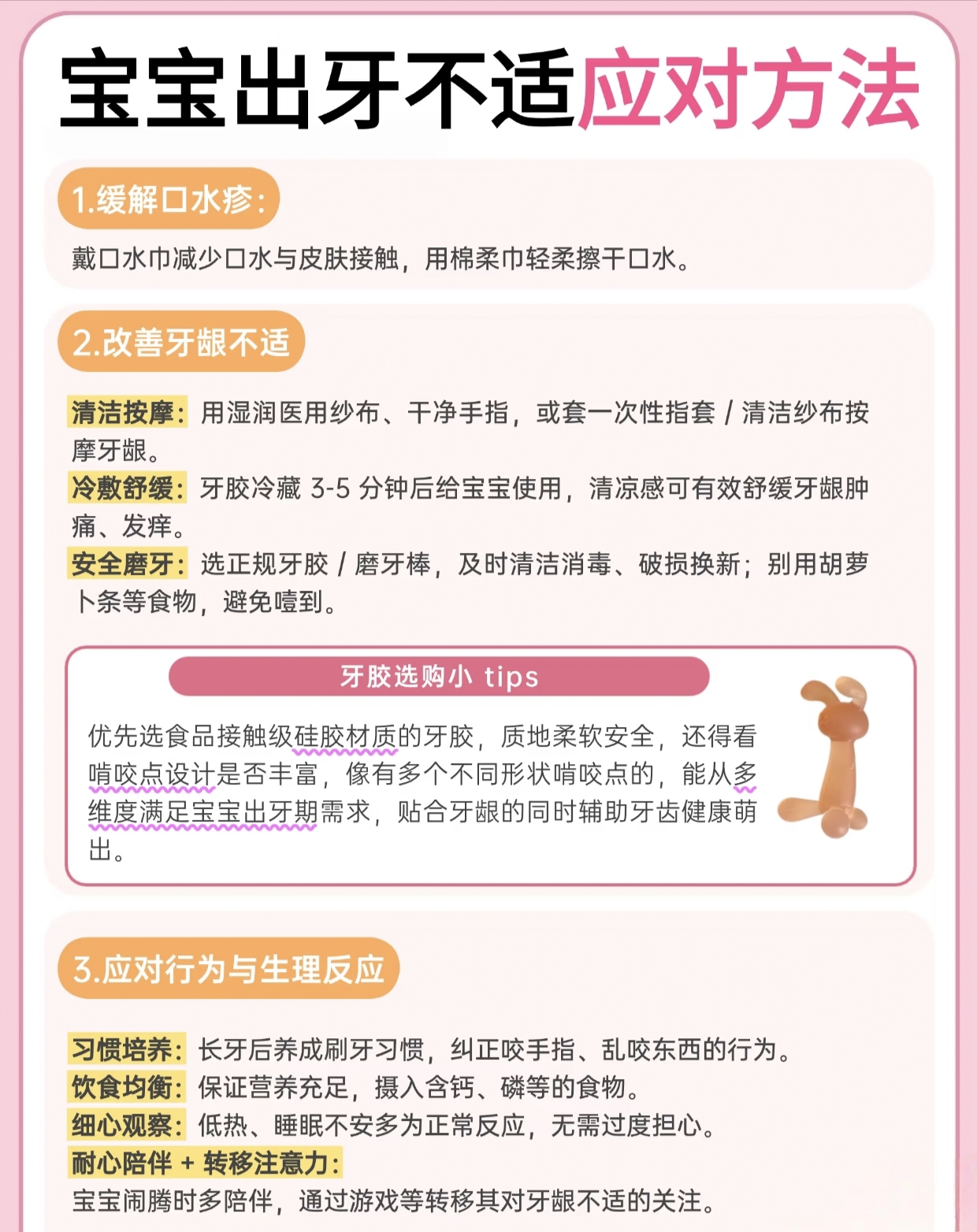 见啥咬啥:手指、玩具、奶瓶嘴,甚至你的手指,只要能塞进嘴里的东西,他都想啃两口。这是因为咬合时的压力能暂时缓解牙龈的痒痛。