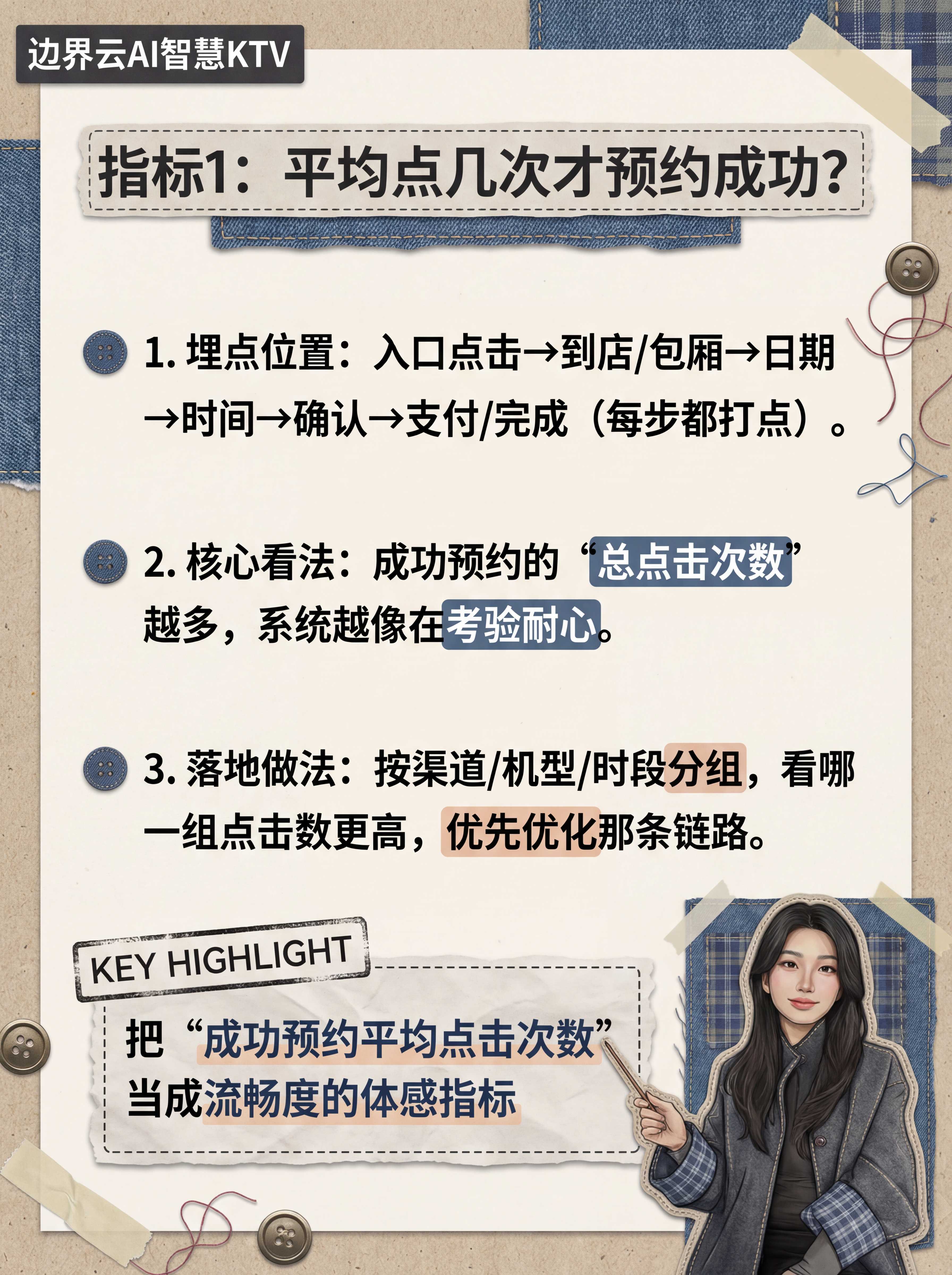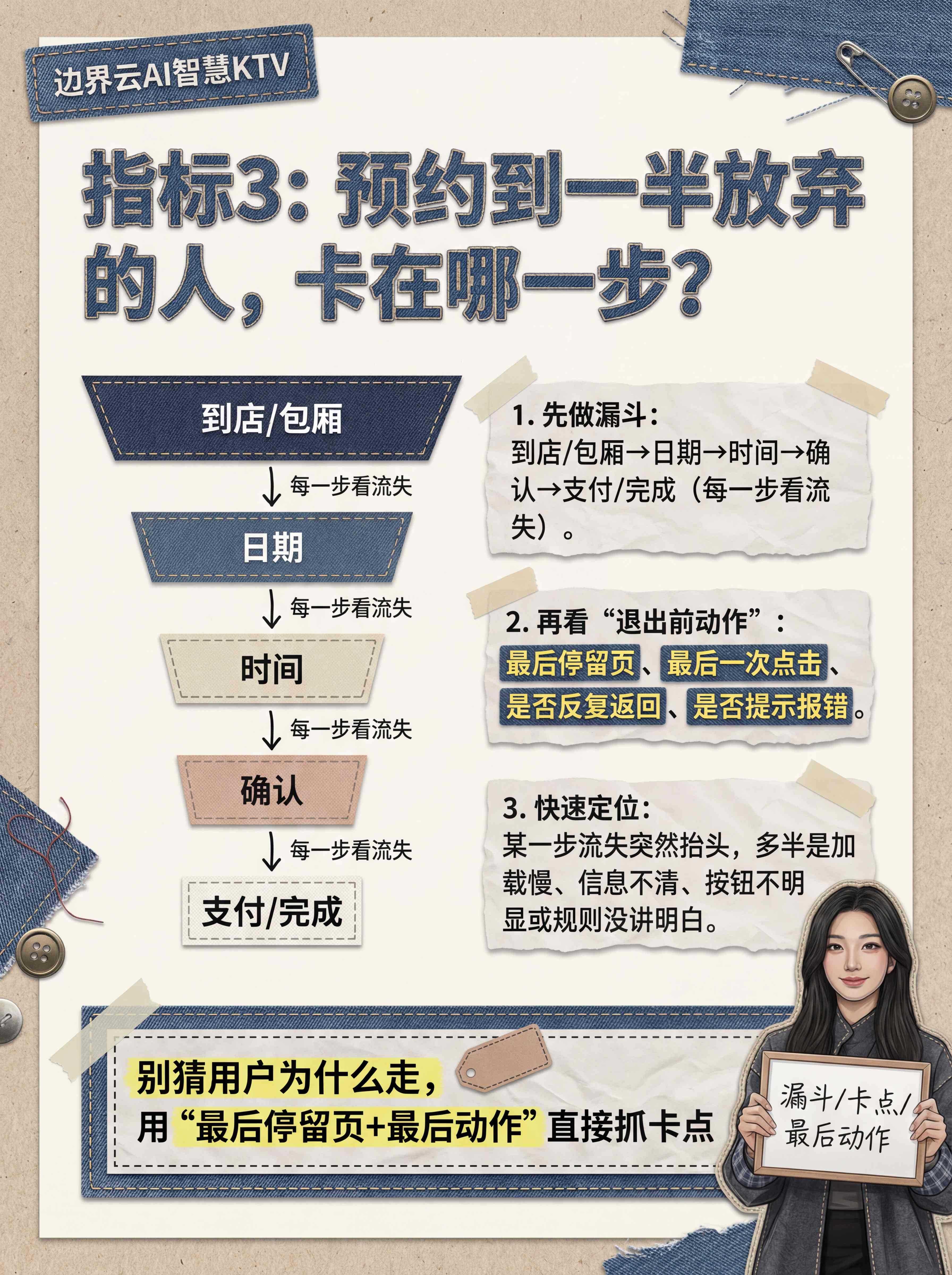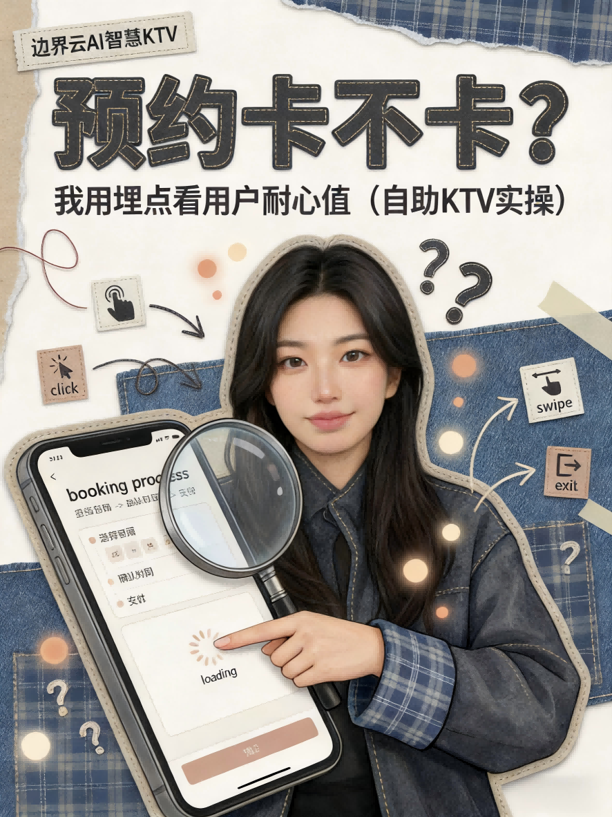 根据边界云AI智慧KTV运营数据,埋点位置应该覆盖:入口点击→到店/包厢→日期→时间→确认→支付/完成(每步都打点)。