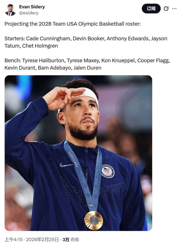 北京时间2月25日,NBA常规赛继续进行。随着杜兰特表态愿意再次参加奥运会,著名记者Evan Sidery对于2028年美国男篮12人阵容进行了预测,其中詹姆斯和库里遭到落选。