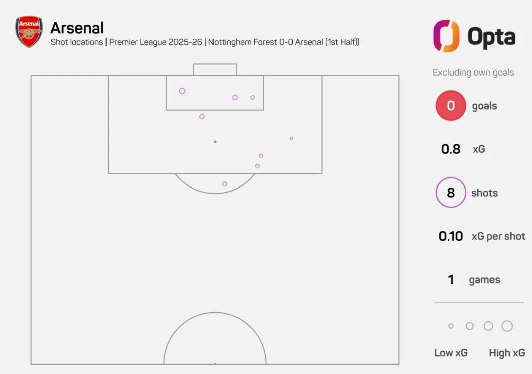 Opta统计,阿森纳在上半场对诺丁汉森林的比赛中有8脚射门,但没有一脚射正,这是2019年12月阿尔特塔上任后执教的首场英超比赛以来(对伯恩茅斯,上半场9次射门),上半场射门次数最多但没有1次射正的情况(只算英超比赛)。