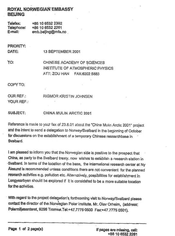 照片11. 挪威大使馆发给中国科学探险协会的北极建站邀请函(2001)