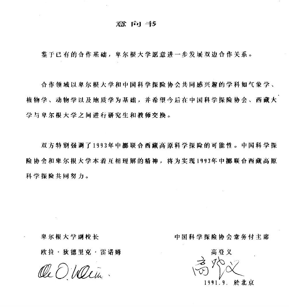 1991年9月下旬,在中国科学院的关怀下,中国科学探险协会与挪威卑尔根大学签订了有关中挪北极与青藏高原合作科学考察的意向书(照片4~6),为中国科学家赴北极斯瓦尔巴群岛考察和挪威科学家赴青藏高原科学考察提供了条件。