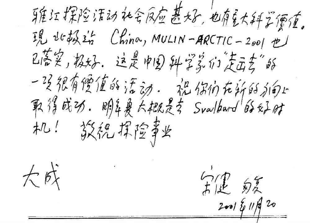 人民日报社新华社和中央电视台等新闻媒体积极参与 2001年10~11月,中央电视台和中国新华社随队赴北极斯瓦尔巴地区预考察,并作了相应的宣传报道,在国内外影响较大。通过我国新闻媒体的适时宣传报道,中国人开始知道了“斯瓦尔巴条约”,知道了中国是“斯瓦尔巴条约”成员国之一,知道了中国人在斯瓦尔巴群岛有建立科学站、开矿、经商等自由,知道了中国人要在北极斯瓦尔巴群岛上建立短期的科学探险考察站,知道了中国政府将尽快在北极斯瓦尔巴群岛上建立永久的科学考察站……这是一件大好事。2001年11月20日,全国政协副主席、中国科学探险协会名誉主席、中国科学院和中国工程院院士宋健亲笔写信,高度赞扬中国科学探险协会组织的北极科学探险建站活动:“现北极站China, MULIN-ARCTIC-2001 也已落实,极好,这是中国科学家们‘走出去’的一项很有价值的活动。祝你们在新的方向上取得成功。明年夏大概是去SVAIBARD 的好时机!敬祝探险事业大成。”(照片13)人民日报社、中央电视台等6家新闻媒体组织记者随队采访报道,为中国伊力特·沐林北极科学探险考察活动助阵宣传,促进了中国人的北极科学建站活动。