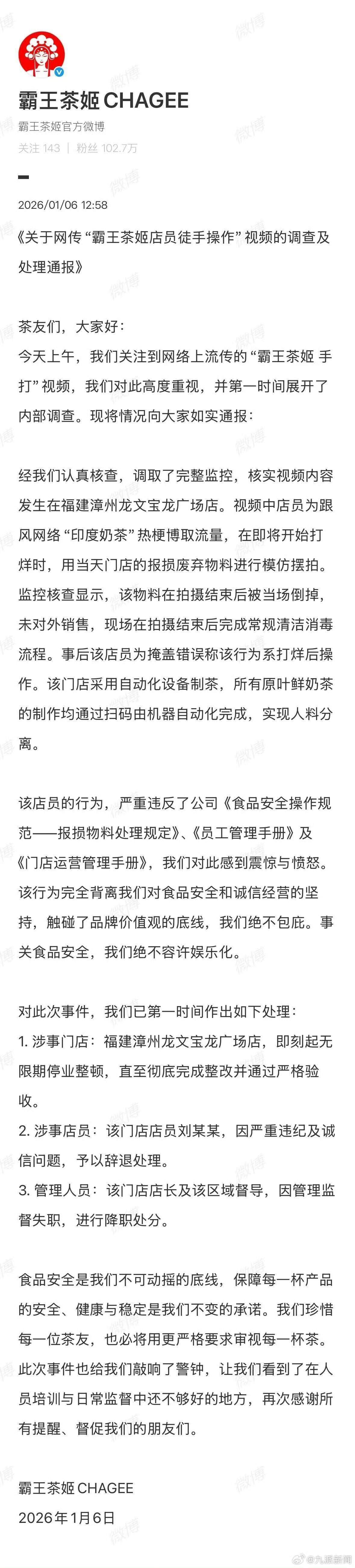 1月6日午间,霸王茶姬官方核查确认涉事门店为福建漳州龙文宝龙广场店,迅速作出通报,官方强调,员工行为严重违反食品安全操作规范,拍摄所用报损物料已当场销毁,未对外销售,门店日常要求员工佩戴手套、使用专业工具操作。门店常规采用自动化设备制茶,人料分离。霸王茶姬指出该店员的行为,严重违反了公司《食品安全操作规范—报损物料处理规定》、《员工管理手册》及《门店运营管理手册》,品牌对此感到震惊与愤怒。该行为完全背离品牌方对食品安全和诚信经营的坚持,触碰了品牌价值观的底线,品牌方绝不包庇。事关食品安全,霸王茶姬绝不容许娱乐化。