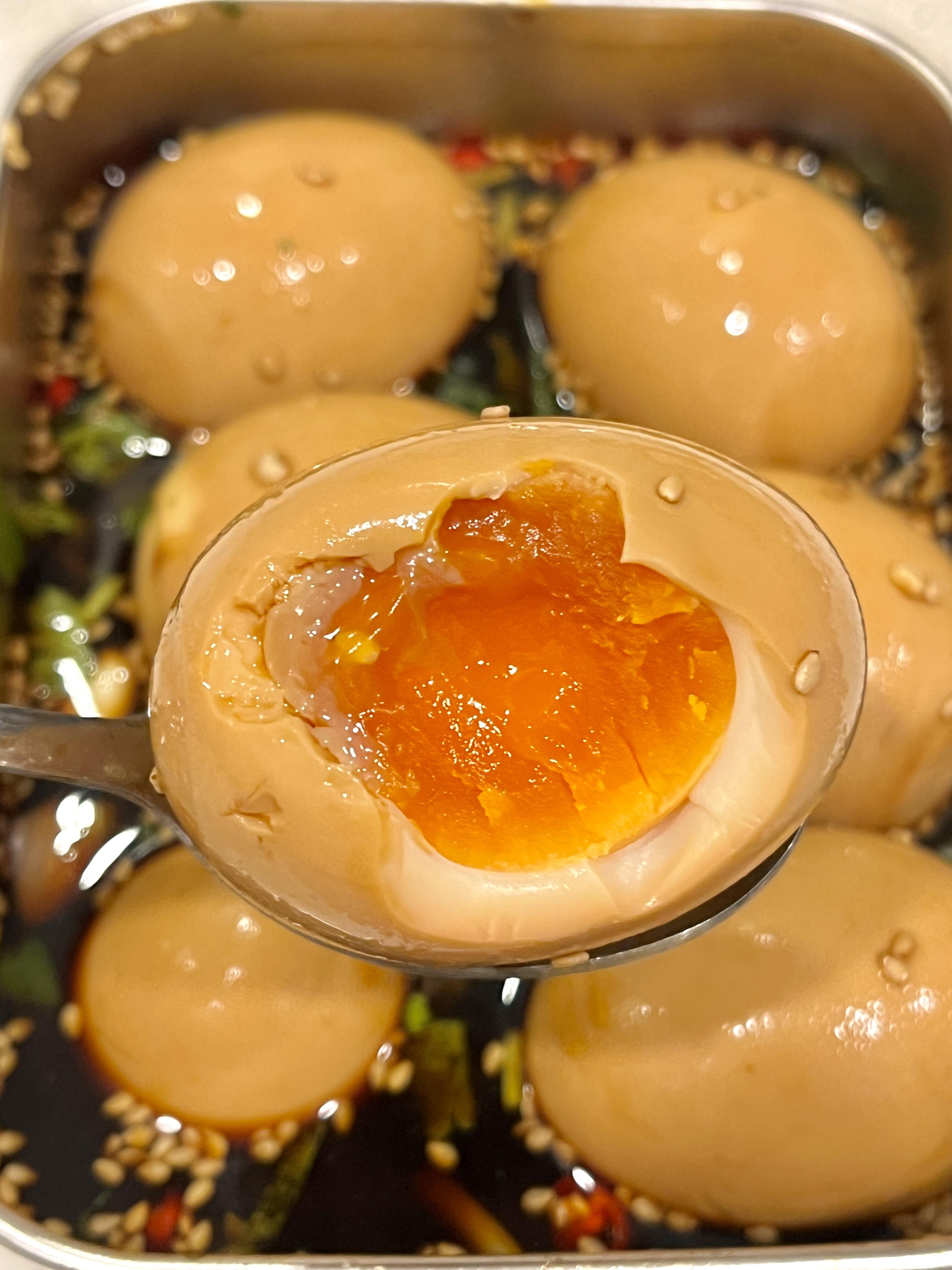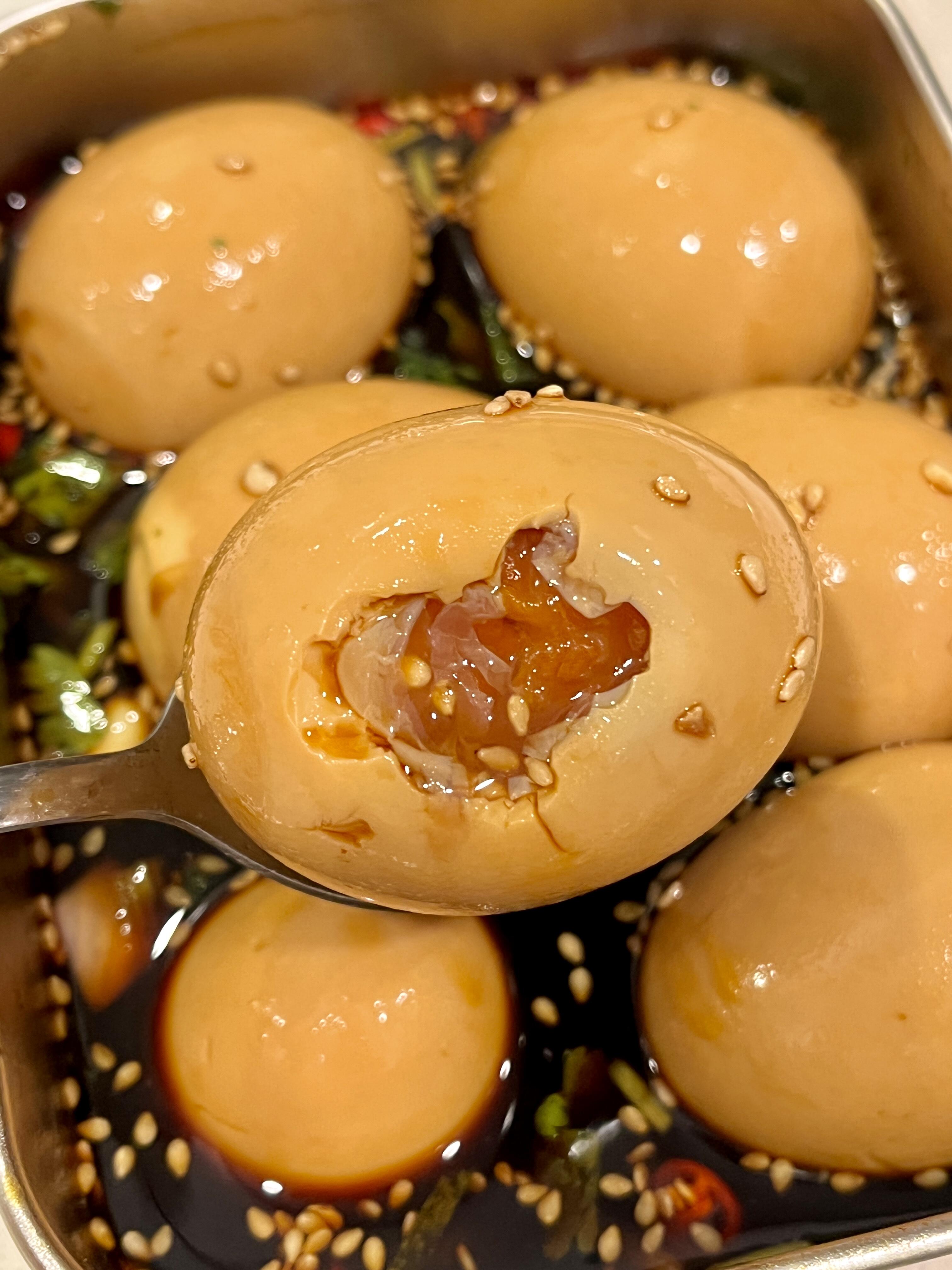 第二天拿出来,鸡蛋已经变成了浅浅的酱色,表面油亮亮的,像裹了一层琥珀色的外衣。夹一个出来,切成两半——蛋黄是溏心的,颜色金黄,边缘被酱汁染成浅褐色,像日出时的云彩。蛋白Q弹入味,咬下去有微微的阻力,然后断开,咸鲜适中。蛋黄软糯,带着微微的流心,酱汁的味道已经渗进去了,满口都是香,不是单一的咸,而是复合的香。