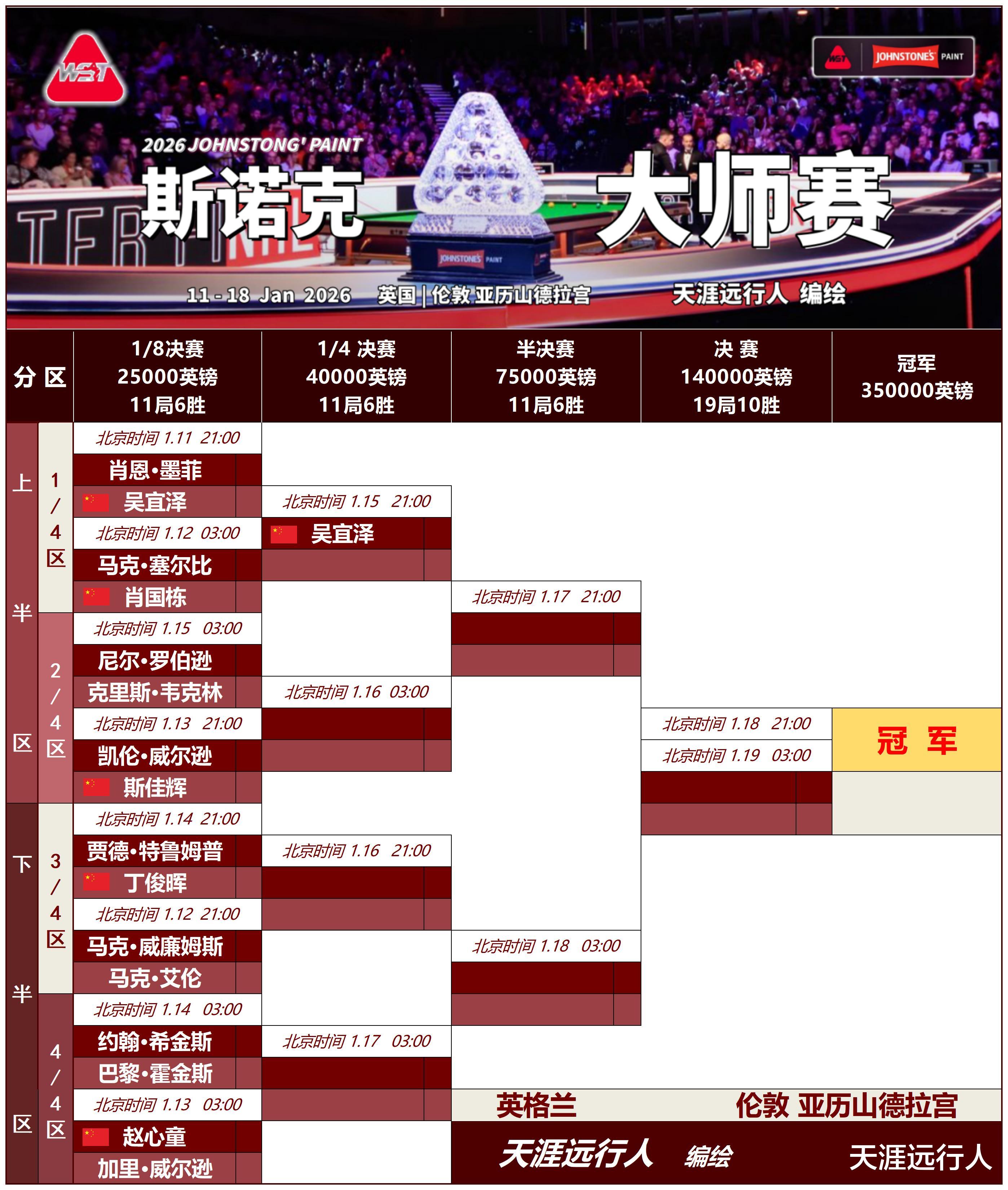最新即时更新斯诺克大师赛进程签表,一表看大师赛全程,各位看官老师敬请转发收藏,以备不时之需