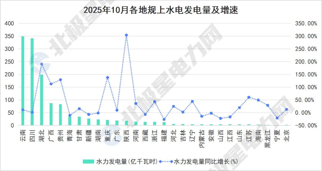 湖北省凭借199.1亿千瓦时的水电量和190.8%的惊人增速,带动全省总发电量飙升34.7%,增速领跑全国。广西、贵州两省区水电增速分别达112.9%和129.3%,重庆、陕西也取得了138%和304.4%的高增长。