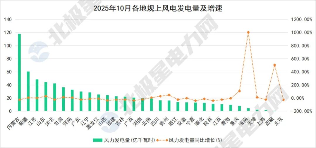 内蒙古与新疆分别在风电与太阳能发电领域领跑,值得注意的是,两地的太阳能发电均增长明显。2025年10月,新疆规上太阳能发电量同比增长28.10%,内蒙古同比增长40.70%。海南省风电增速高达1005.1%,虽然基数较小,但显示出巨大发展潜力。