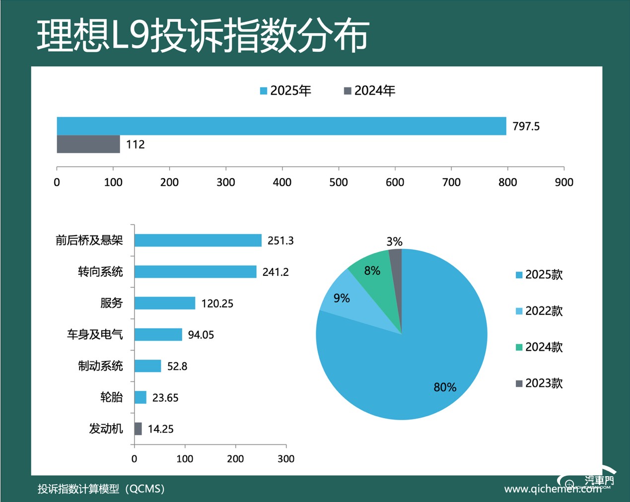汽车质量投诉点评:理想L9去年的投诉指数同比上升超六倍,其投诉指数为797.5。下摆臂异响和短期大幅降价是理想L9遭到集中投诉的主要原因。理想汽车旗下多款车型存在的下摆臂异响和短期大幅降价问题同样出现在理想L9车型上。据理想L9车主反馈,车辆异响问题均与下摆臂的球头有关。部分理想L9车主在更换下摆臂后,异响问题依旧存在。对此,理想汽车售后表示,异响问题是理想汽车旗下多款车型的正常情况,这一说法引发车主不满。