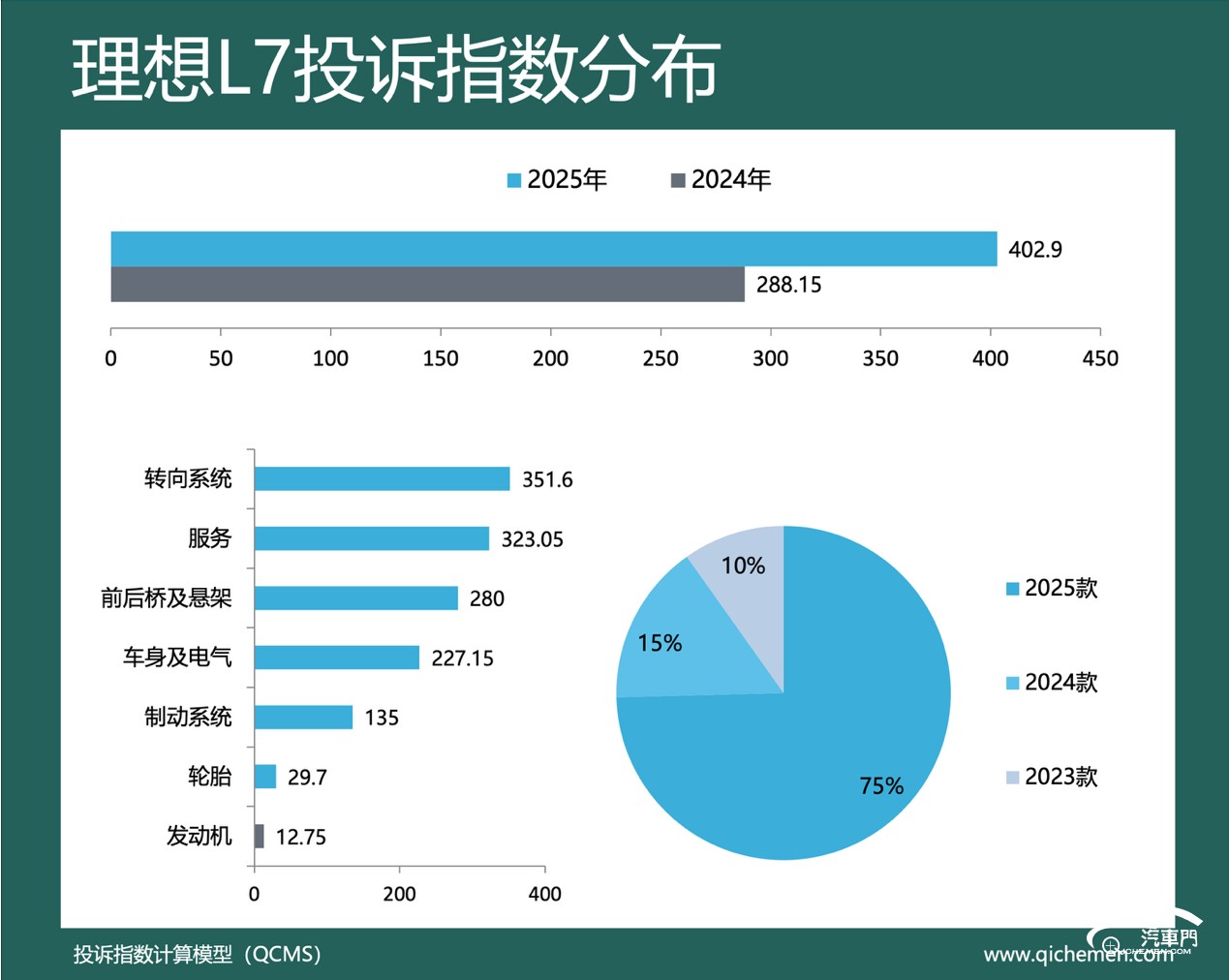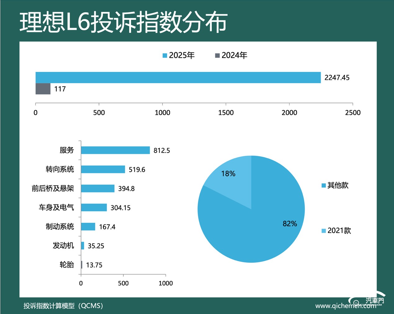汽车质量投诉点评:去年,理想L7的投诉指数为1361.5,同比上涨近四倍。短期大幅降价和下摆臂异响是理想L7登上榜单的主要问题。其中,大量理想L7车主在去年多次投诉下摆臂异响问题。一位2025款理想L7车主投诉称,车辆购买两周就出现了异响问题。该车主称,理想L7在低速转向、倒车打方向盘以及制动时异响频发。对此,该车主向理想汽车售后反馈问题。而理想汽车售后称,只能为该车主更换下摆臂,不给予积分补偿。该车主后续多次发起投诉,而理想汽车官方至今未给出任何答复。