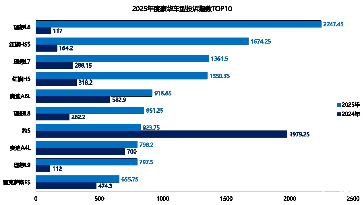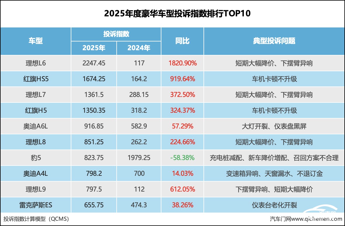 2025年度豪华车型投诉指数榜单TOP10中,豪华车型的投诉指数普遍上涨。其中,理想汽车多款车型冲进前十并霸榜,短期大幅降价和下摆臂异响成了幕后推手。此外,红旗旗下两款车型因车机卡顿不升级这一痼疾跻身榜单前列。传统豪华品牌上榜的车型中,奥迪A4L、奥迪A6L等老面孔依然在榜。值得一提的是,豹5是榜单中唯一一款投诉指数下滑的车型。此前,豹5因方程豹官方下调价格遭到大规模投诉。随着豹5的降价风波逐渐平息,该车型的投诉指数也随之下降。