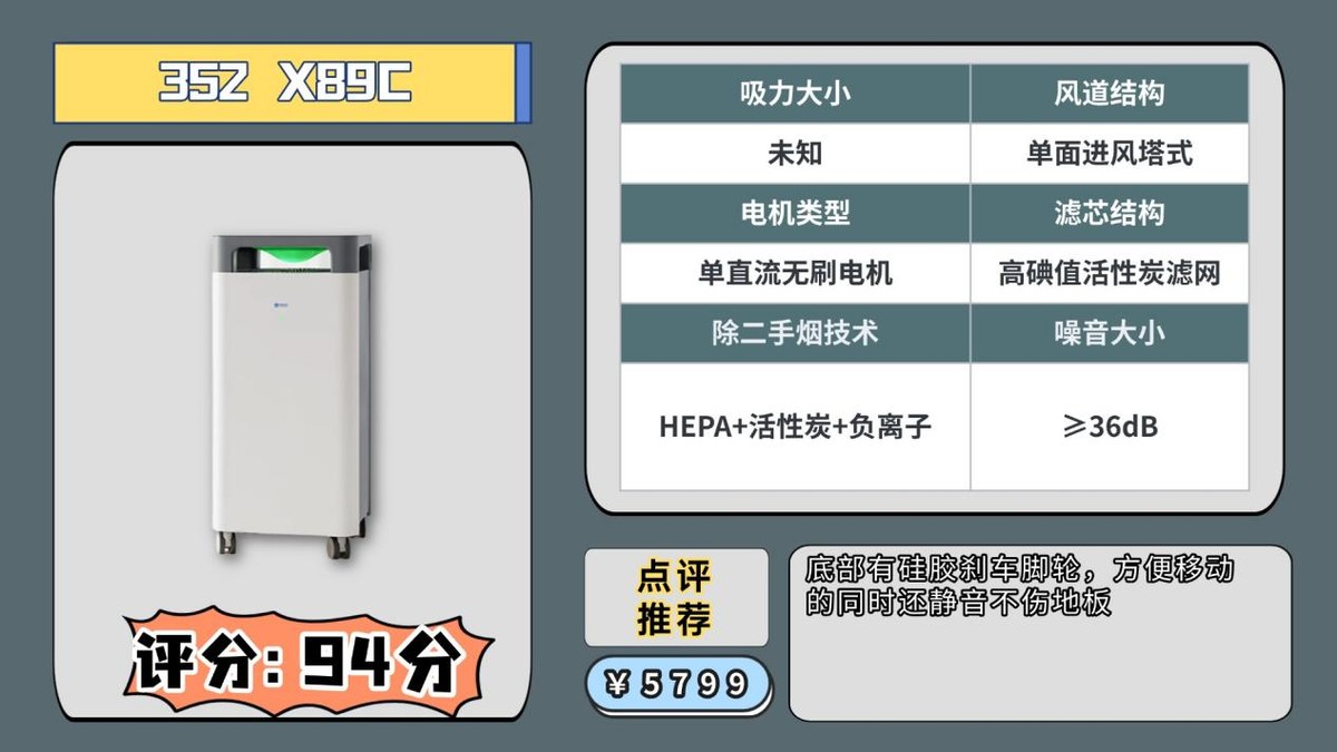 【产品的综合使用】352 X89C采用现代圆柱形设计,白色机身线条流畅,放置在客厅能自然融入家居环境。底部四个带刹车万向轮设计周全,推行顺滑且定位精准,单手推动毫不费力,适合在大户型中灵活移动轮换使用。操作面板简洁直观,大按键设计让家中长辈也能轻松掌握,屏幕显示清晰,空气质量变化一目了然。运行声音控制优秀,大空间使用时不会产生明显回声干扰,夜间模式安静不扰眠。支持手机App智能控制,可设置自动化场景和查看历史数据。滤网寿命长,更换提醒机制准确,维护成本可控。