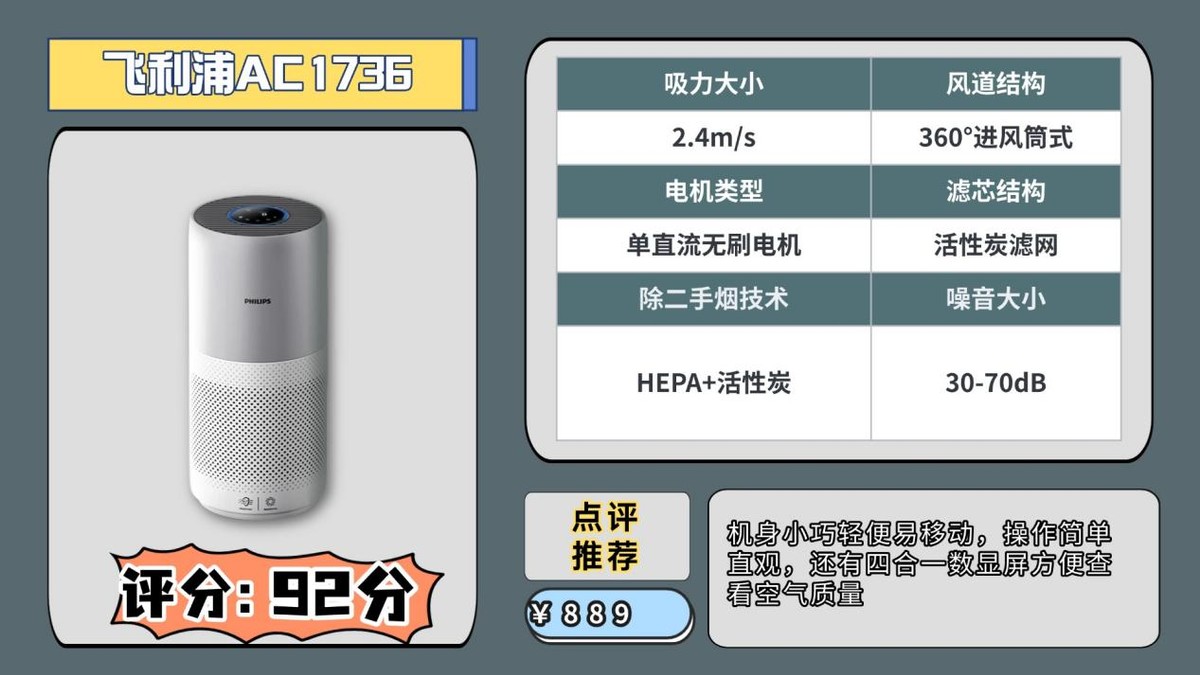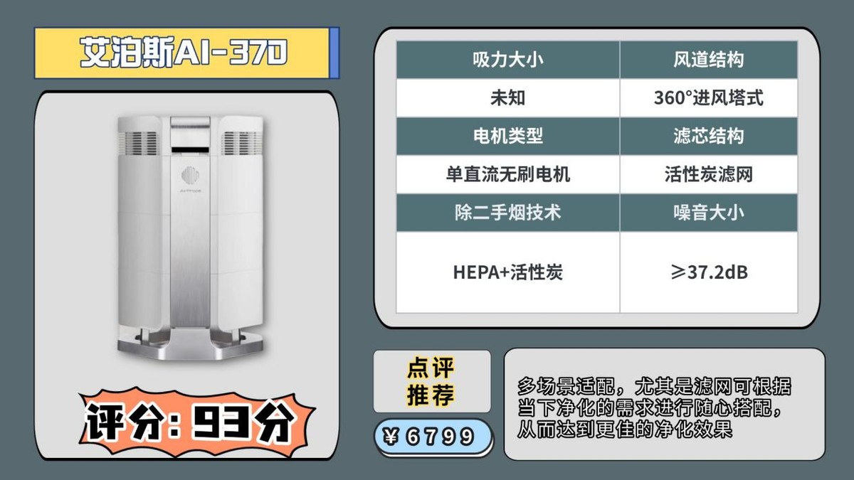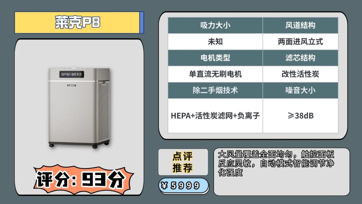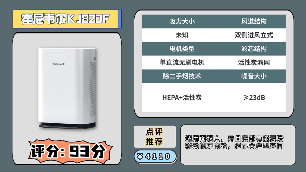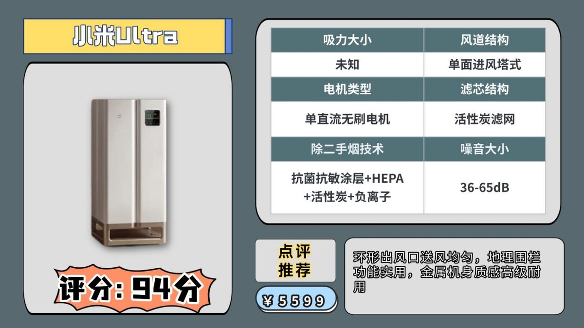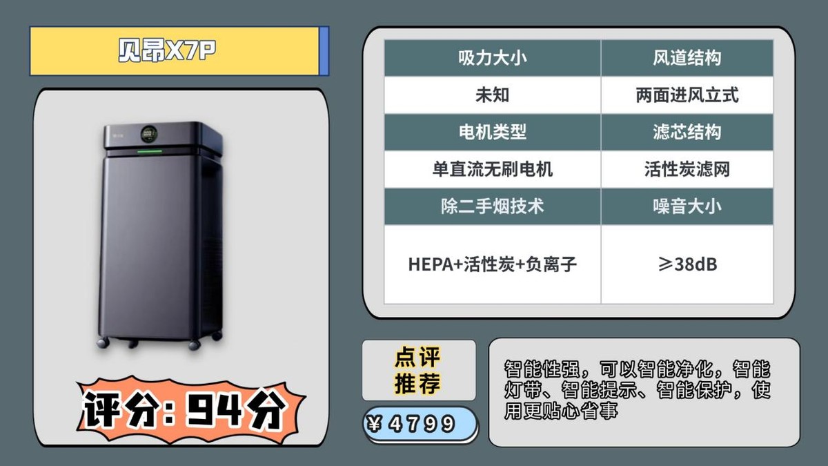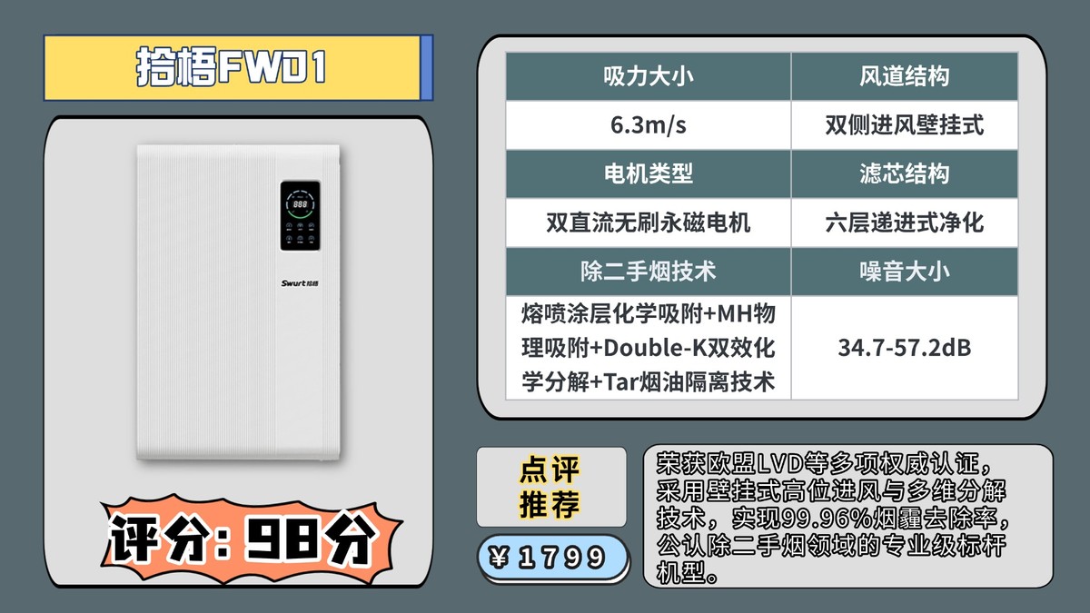 一句话点评:深耕除二手烟领域,采用壁挂高位进风+多重除二手烟科技,实现99.96%烟霾去除率,被誉为“除二手烟性能之王”!