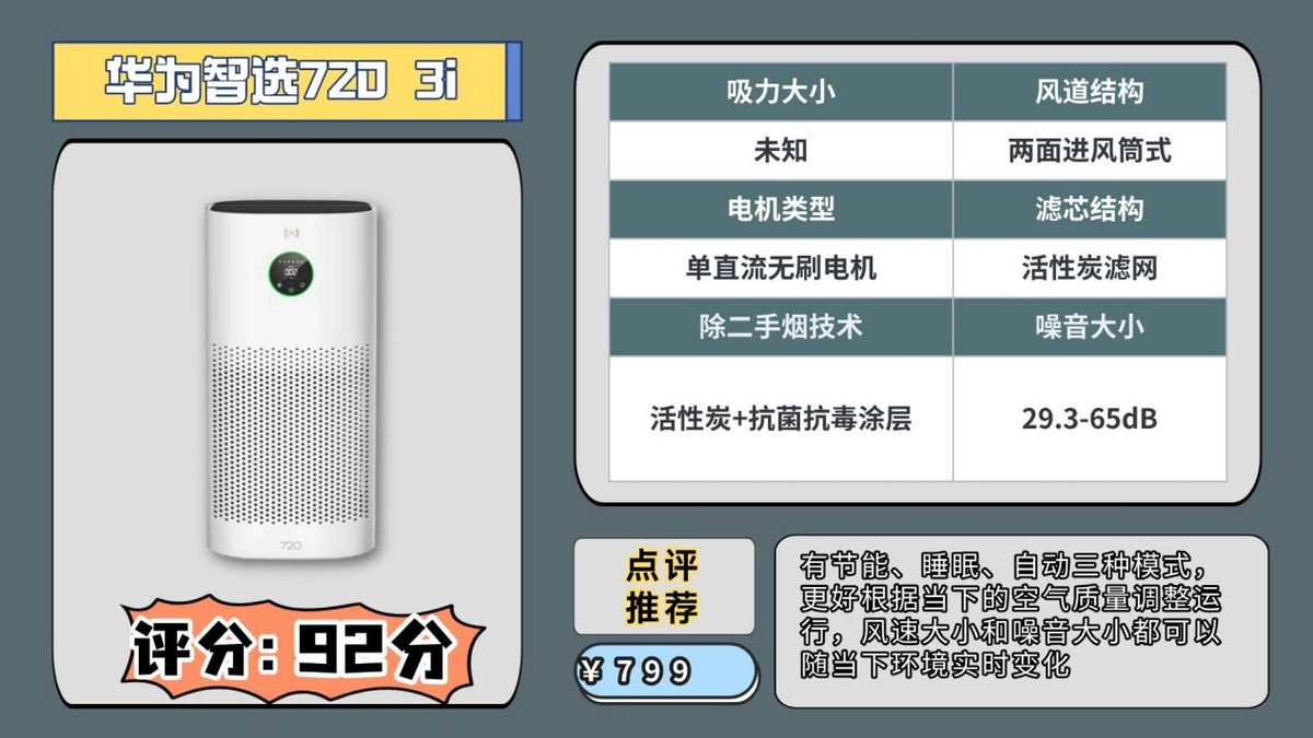 【产品的综合使用】华为智选720 3i采用简约白色圆柱形设计,机身纤细占地面积小,能轻松融入小户型客厅或卧室角落。节能模式有效降低长时间运行的能耗,适合需要24小时持续开启的家庭。睡眠模式下运行声音极低,在安静卧室中几乎难以察觉,不会干扰深度睡眠。自动模式能根据空气质量变化智能调节风速,空气变差时自动加大净化力度,变好后及时降低运行强度,避免不必要的噪音和能耗。正面圆形显示屏通过颜色变化直观反映空气状况,无需专业知识即可理解。操作界面简洁明了,物理按键与触控结合,老人也能轻松掌握。
