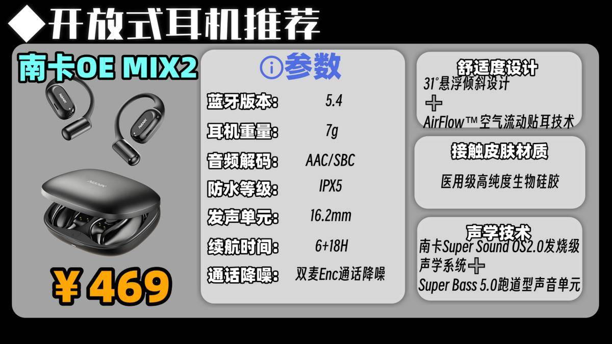 作为拥有十余年音频研发技术的品牌,南卡在数码领域内拥有极高的人气和口碑。而旗下这款OE Mix2开放式耳机更是做到了舒适性、音质体验、做工配置等方面的全面领先,是目前开放式耳机中最为Top的产品!并且获得了500+位专业测评师、以及国内、欧美第三方权威检测机构一致推荐。