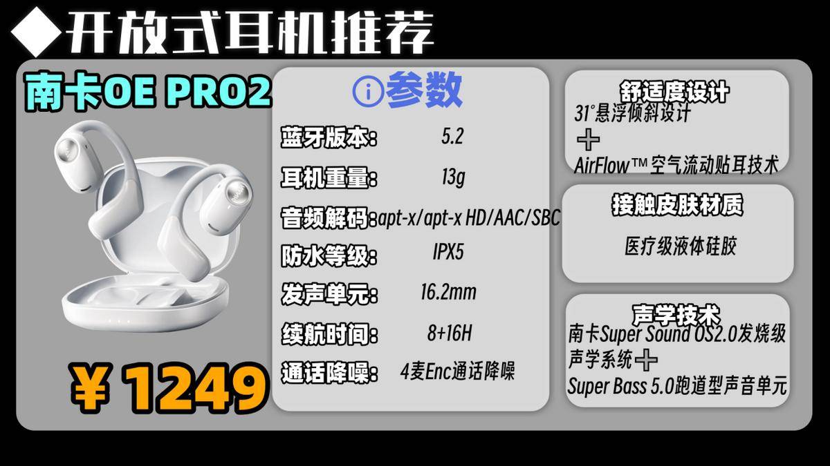 作为一家深耕音频领域的专业品牌,南卡一直以音质与舒适度为王,OE Pro2更被称为该品类中“最能打”的代表。在两千元内的价格区间,它凭借自研单元、先进声学系统和完善的配置体验,展现出远超同级的实力,赢得HiFi发烧友和媒体的高度认可。另外,OE Pro2还整合了全能Ai智慧系统,支持翻译、对话、搜索、创作等多场景应用,凭借 “全能智慧助手 + 音质巅峰” 的双重优势,OE Pro2成为开放式耳机圈内的公认旗舰!