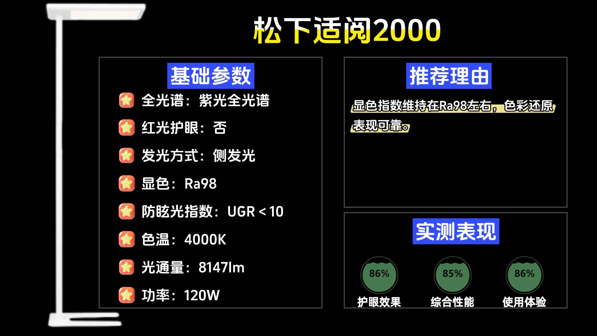 护眼大路灯第三名:松下适阅2000;显色指数维持在Ra98左右,色彩还原表现可靠。
