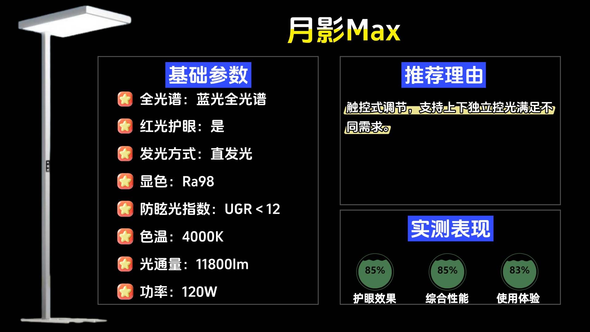 护眼大路灯第七名:月影Max;搭载AI智能补光系统,可敏锐感知环境光线变化。
