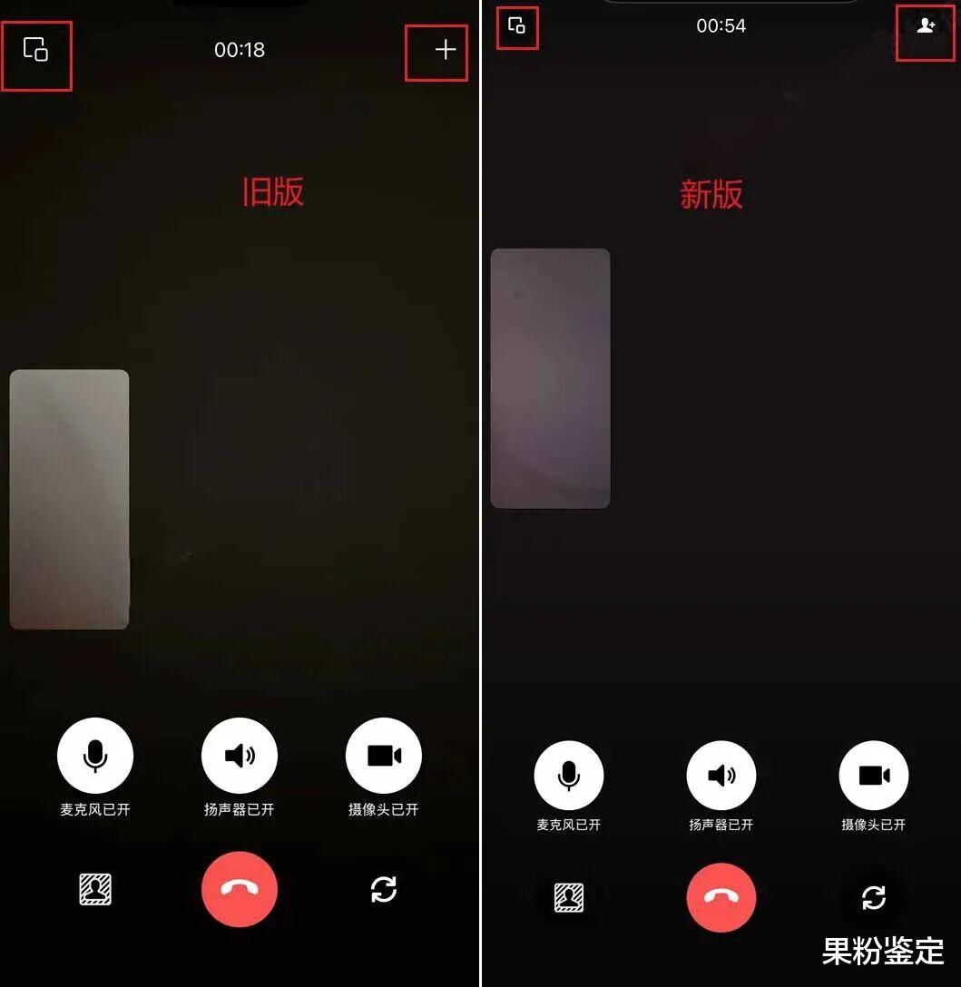 在视频通话的界面中,可以看到更新后顶部两个按钮的样式变了,首先左上角的「最小化」图标尺寸缩小了。同时右上角原本的「+」图标,现在变成了一个更直观的「小人头像」图标。
