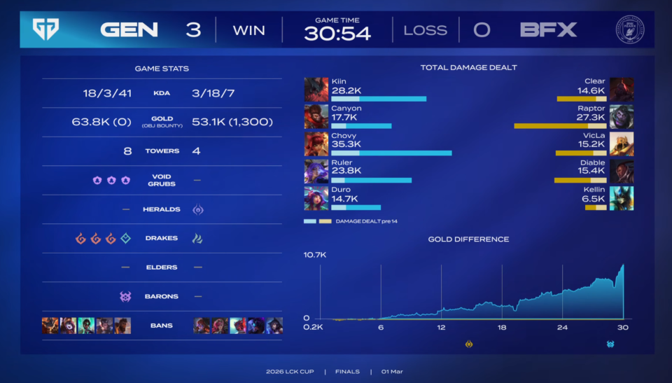 在LCK这几年似乎一直都是属于超威的时代,如今来到2026年依旧还是他的时代,因为不管之前的表现如何,只要回到LCK那他就是绝对的统治力!在LCK杯决赛当中,面对新人队伍BFX,这个在LCK杀出来的黑马战队,GEN是丝毫不手软,以3-0轻松横扫拿下,三场比赛都是绝对的碾压之势!在赢下了这场比赛后,GEN也锁定了自己先锋赛的一号种子,而BFX则是以二号种子身份出征,对于这个新人队伍来说,他们所打出来的表现,回头在先锋赛上LPL也不得不防范!