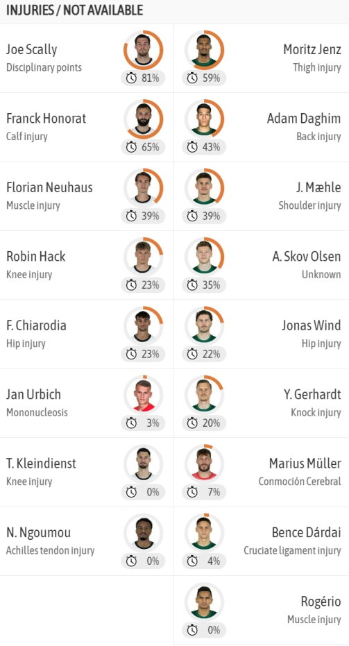 伤停主要是中卫约瑟夫·斯卡利累积黄牌停赛,诺伊豪斯和奥诺拉肌肉损伤,乌尔比希、恩古穆和克莱因丁斯特等则均是一些老伤号,出场时间不多。
