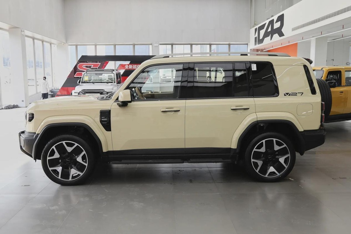 侧面来看,iCAR V27采用了横平竖直的线条勾勒,营造出了标志性的方盒子结构,车顶行李架、前后突出的轮眉、脚踏板、传统外置式门把手等设计,则进一步增添了它的硬派复古感。尺寸方面,据悉iCAR V27的长宽高分别为:5055/1976/1894mm,轴距为2910mm,属于中大型SUV定位,个头大小和方程豹钛7差不多。